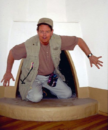 [Tom, scouting a location, tries out a Kiva fireplace for a humorous shot.]